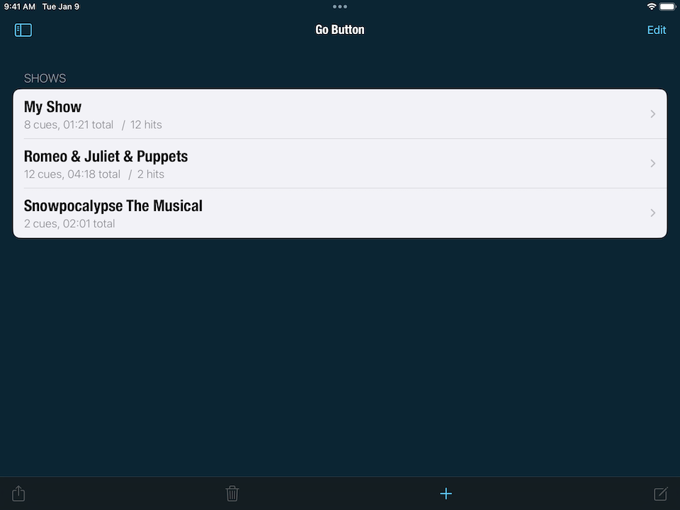 When you first launch Go Button, the Home screen appears. This is where you manage your list of shows. From here, you can create a new show, as well as duplicate, share, and delete existing shows.