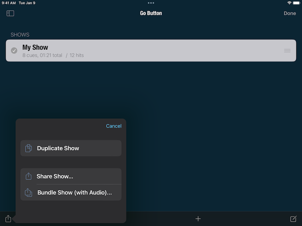 To export a show, navigate to Go Button's Home Screen, and tap Edit in the upper right corner. Then, select the show you want to export and tap the Action button.